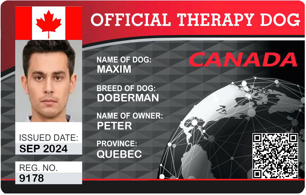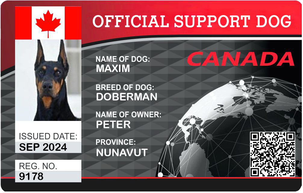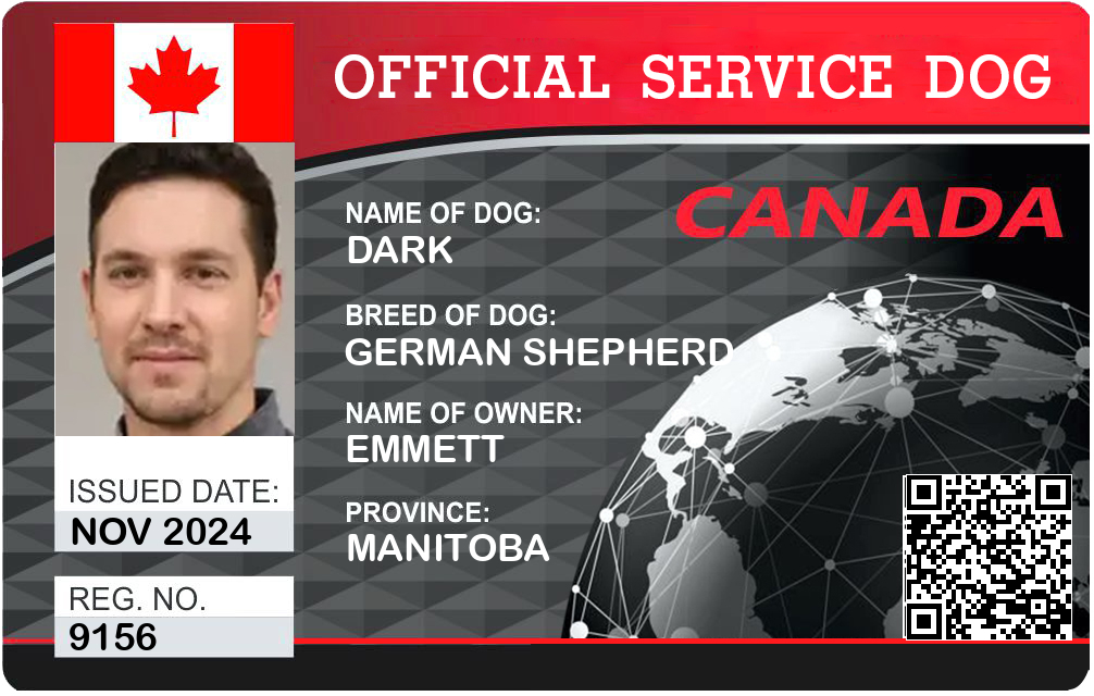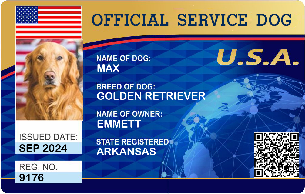 Our Customized Physical & Digital ID Cards give you and your Dog credibility by clearly stating that your dog is a registered Working Dog Dog. This ID Badge features your Dog OR Owner photo along with State/Province of registration so you can easily inform anyone that inquires as well as others of your rights wherever you may be.
