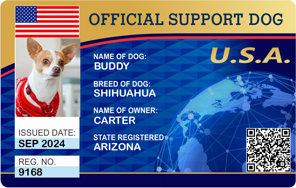 Proper identification such as ID cards, tags is key to letting others know your dog is officially registered as a Service Or Support Dog. Make Your ID Card Instantly and browse our one of a kind products!